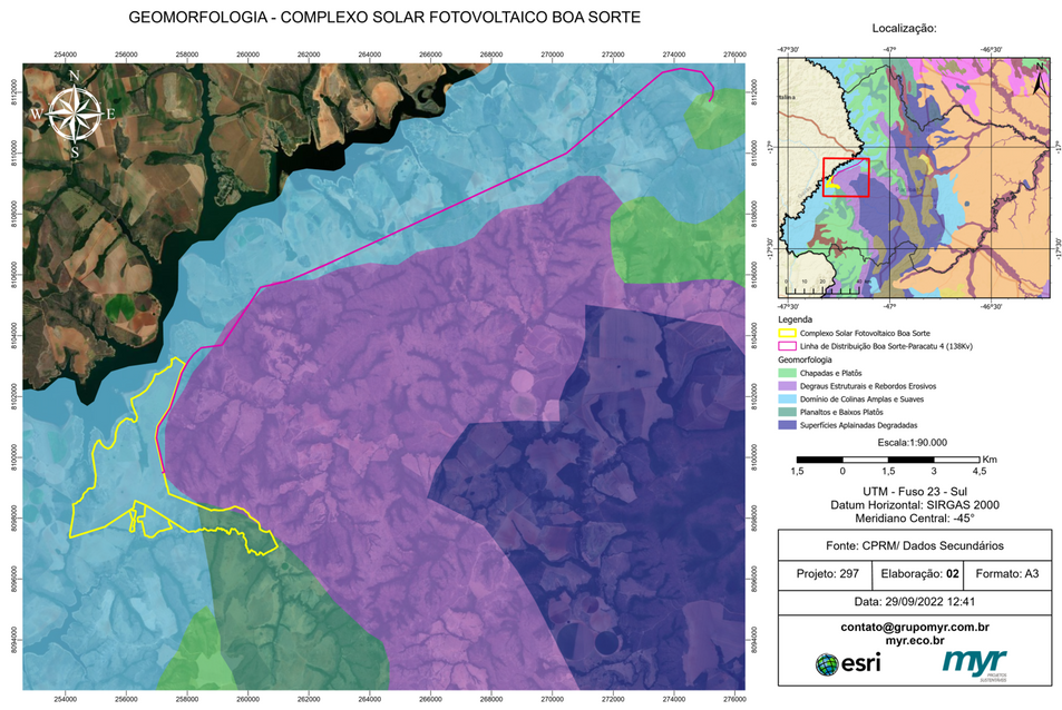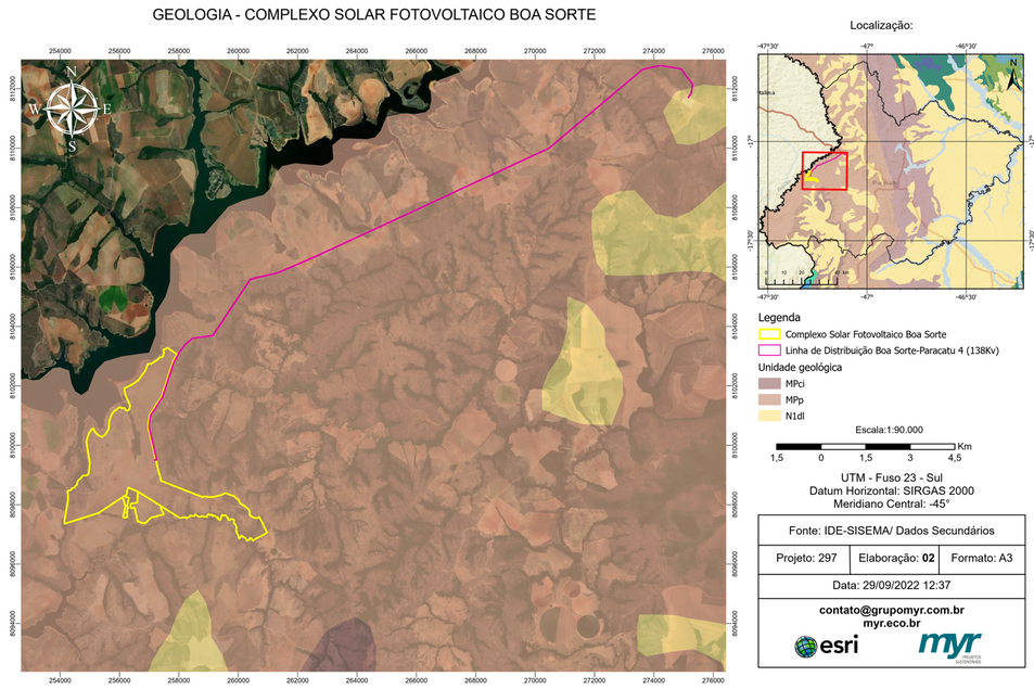 O terreno do Complexo Solar Fotovoltaico Boa Sorte apresenta, em sua formação, a unidade geológica conhecida pela simbologia MPp, classificação característica do Grupo Paracatu. O território é composto quase que em sua totalidade pela unidade geomorfológica caracterizada por domínio de colinas amplas e suaves, tendo como formação adjacente, a leste, a geologia composta por planaltos baixos e platôs. O solo é formado pelos grupos classificados como RLd1 e RLd2, categorias que se referem, especificamente, aos Neossolos Litólicos Distróficos (RLd1), mais presentes na porção oeste, e aos Neossolos Litólicos Distróficos com Latossolos Amarelos Distróficos (RLd2), predominantes na porção leste.