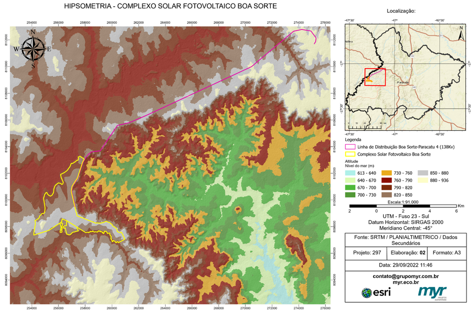 O polígono de intervenção do Complexo Solar Fotovoltaico Boa Sorte é majoritariamente plano, sendo inteiramente composto por declividades inferiores a 15%. O terreno em estudo apresenta altimetrias altas, com cotas variando entre 790 e 936 metros acima do nível do mar.