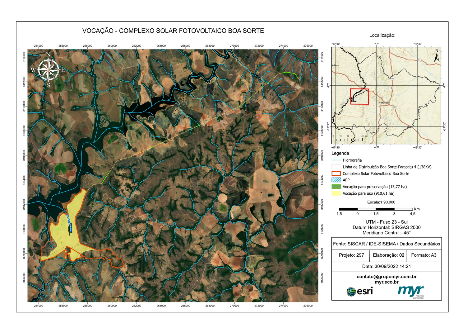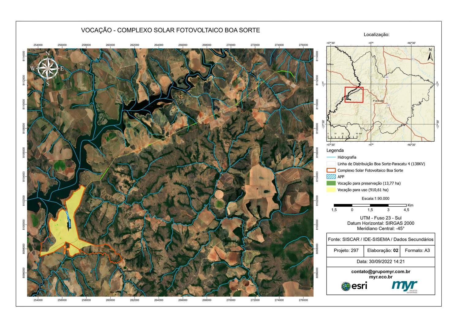 O Complexo Solar Fotovoltaico Boa Sorte está posicionado nas imediações a oeste da Unidade de Conservação de Proteção Integral denominada Parque Estadual de Paracatu. O trecho final da Linha de Distribuição transpassa a zona de amortecimento do Parque, haja vista que a Subestação Paracatu 4, vértice final da LD Boa Sorte – Paracatu 4, encontra-se instalada dentro dos limites da zona de amortecimento, sendo impossível conectar o Complexo à SE sem transpassar o distanciamento delimitado pelo Plano de Manejo.